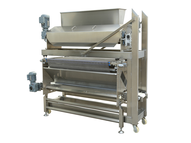 該設備應用于將固體顆?;蛘叻蹱钫{(diào)味料,鹽,糖,芝麻及果仁片等撒布在面皮或則餅干上?;厥諜C回收多余的撒布物料循環(huán)利用。